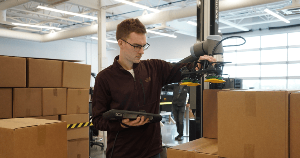 Vous êtes confrontés à des problèmes de main-d’œuvre et d’inefficacité ? Découvrez comment les solutions d’encaissage et de palettisation de Robotiq révolutionnent vos processus de packaging. Vous permettant d’augmenter votre vitesse de production, de réduire les coûts et de libérer les employés pour qu’ils puissent se concentrer sur d’autres tâches.